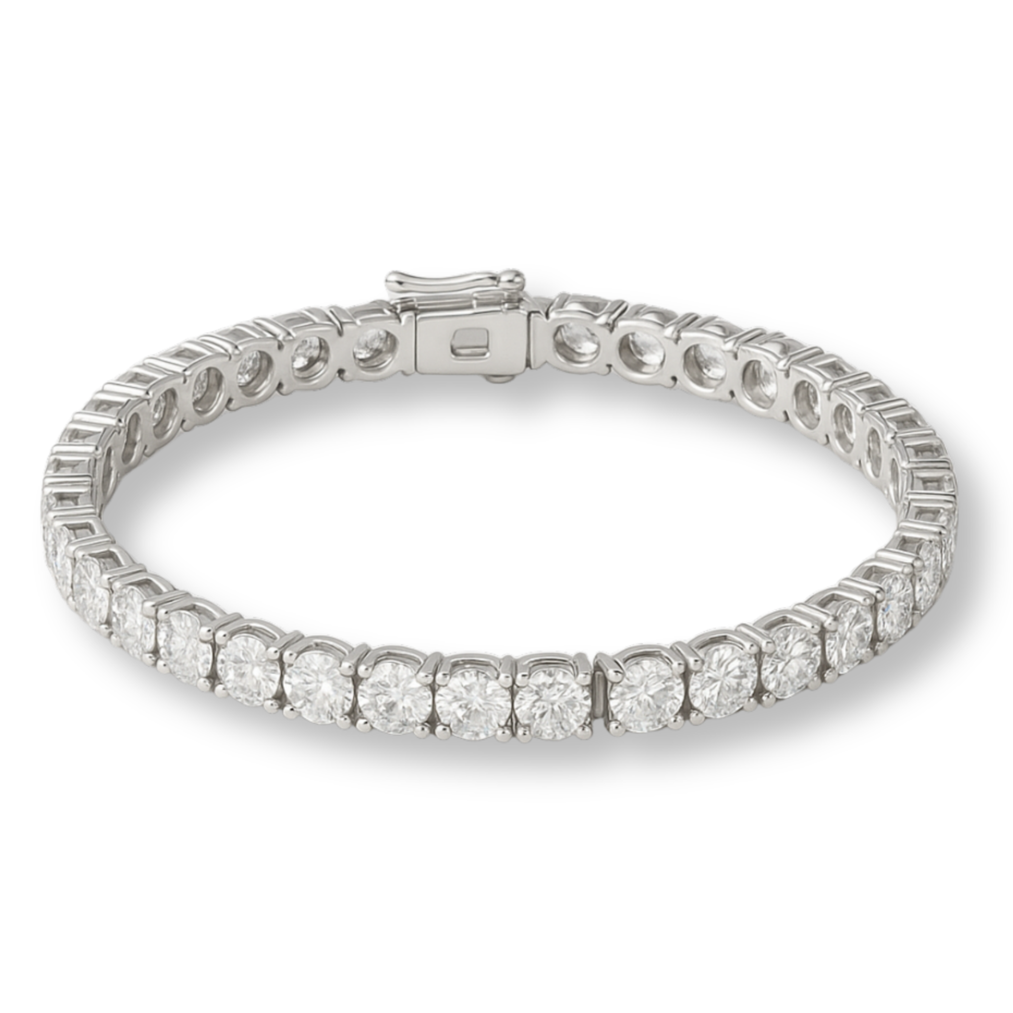 Una joya digna de las más refinadas colecciones: pulsera tennis elaborada en plata esterlina 925, realzada con un baño en oro blanco de 18 quilates para un acabado impecable y duradero. Cada eslabón engasta meticulosamente moissanitas VVS1 claridad D, piedras de pureza y color perfectos, cuyo destello rivaliza con el diamante más selecto. Su diseño atemporal y su impecable manufactura la convierten en una pieza de distinción, pensada para quienes aprecian la verdadera esencia del lujo.