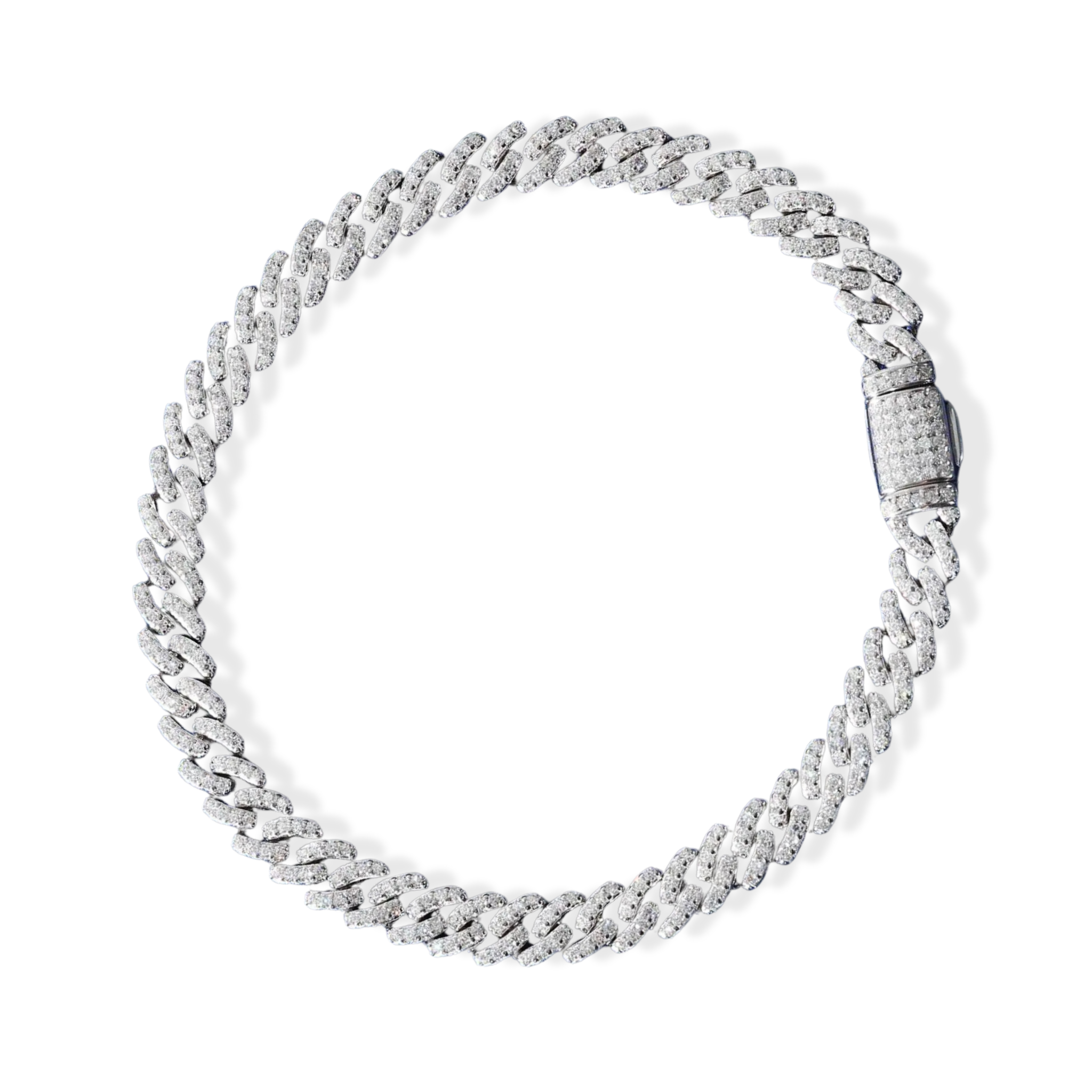 Cubana elaborada en plata esterlina 925, realzada con un sofisticado baño en oro blanco de 18 quilates e incrustaciones en moissanitas VVS1 claridad D, que aportan un destello incomparable y elegancia en todo momento.