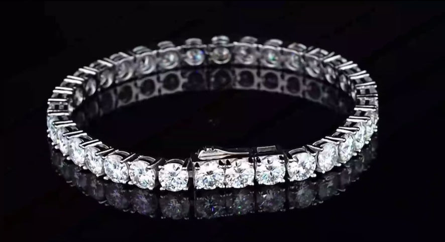 Una joya digna de las más refinadas colecciones: pulsera tennis elaborada en plata esterlina 925, realzada con un baño en oro blanco de 18 quilates para un acabado impecable y duradero. Cada eslabón engasta meticulosamente moissanitas VVS1 claridad D, piedras de pureza y color perfectos, cuyo destello rivaliza con el diamante más selecto. Su diseño atemporal y su impecable manufactura la convierten en una pieza de distinción, pensada para quienes aprecian la verdadera esencia del lujo.